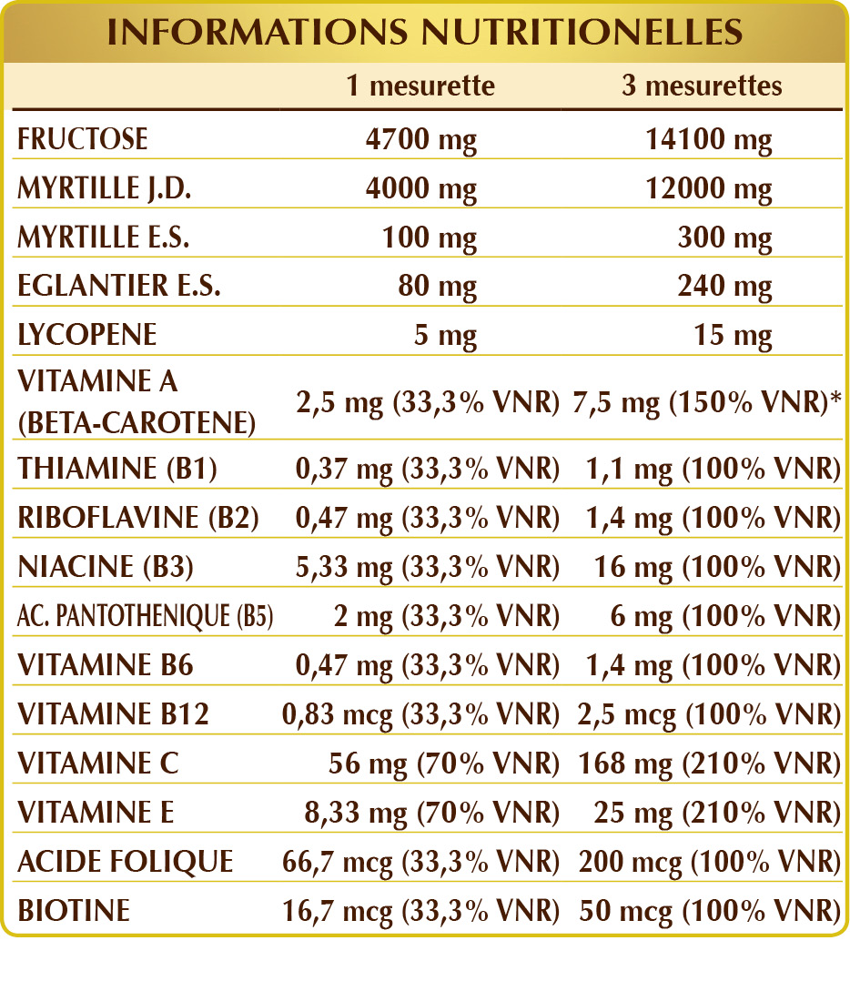 3 mesurettes rases (30 g) contiennent en moyenne: 12 g de jus déshydraté de myrtille, correspondant à 50 g de myrtilles fraîches. Pour produire cette boîte nous avons utilisé 600 g de myrtilles fraîches.
