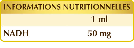 Supplément de NADH, une coenzyme naturellement synthétisée par l'organisme qui participe au niveau cellulaire aux processus de production d'énergie. Son supplémentation peut être utile car sa présence a tendance à diminuer dans des conditions particulières et avec l'âge.