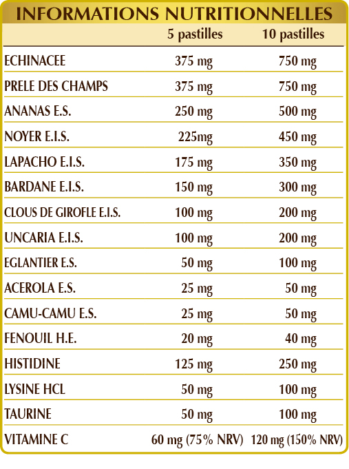 Prêle des champs ou queue de cheval (Equisetum arvense) herbe, échinacée (Echinacea angustifolia, purpurea et pallida) racines, ananas (Ananas sativus) tiges des fruits E.S. (bromélaïne 2 500 GDU/g), noix (Juglans regia) fruits frais immatures (verts) E.I.S., lapacho ou pau d'arco (Tecoma curialis ou Tabebuia avellanedae) écorces E.I.S., bardane (Arctium lappa) herbes fraîches et racines E.I.S., cellulose microcristalline°, gomme arabique°, (L-)histidine, clous de girofle (Eugenia caryophyllata) boutons floraux E.I.S., écorces de griffe de chat (Uncaria tomentosa) E.I.S., dioxyde de silicium, églantier (Rosa canina) fruits E.S. (titré à 70% de vitamine C), (L-)lysine HCL ou chlorhydrate, taurine, lactate de calcium, phosphate de potassium dibasique, acérola E.S. (Malpighia glabra) fruits E.S. (titré à 50 % de vitamine C), camu-camu (Myrciaria dubia) fruits E.S. (titré à 50% de vitamine C), fenouil (Foeniculum vulgare) fruits H.E., stéarate de magnésium d'origine végétale°°.