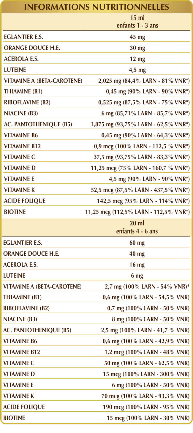 NRV°= Valeur nutritionnelle de référence pour les enfants de 1 à -3 ans (Directive 2006 / 141 / CE).