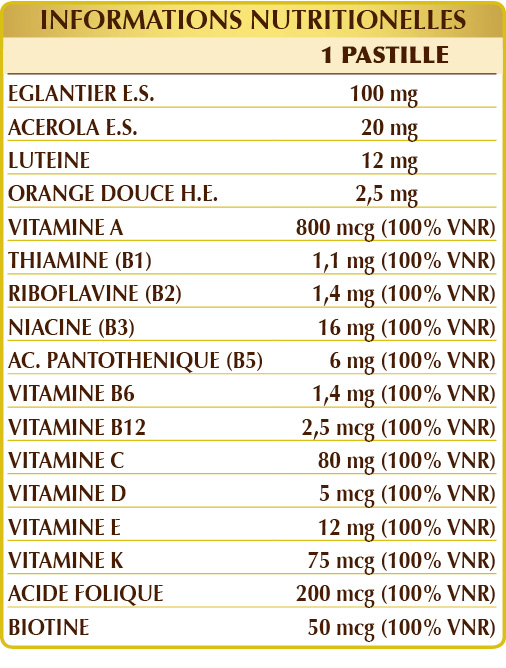 Multivitamique contenant 100% du VNR de toutes les vitamines dans une seule pastille.