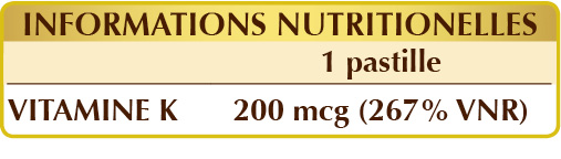 200 mcg de vitamine K (267% VNR) dans chaque pastille.