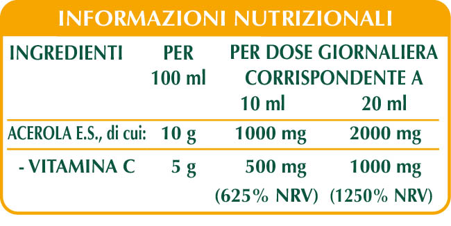 L’Acerola svolge un’azione di sostegno e ricostituente, è naturalmente ricca di vitamina C che possiede molteplici proprietà: favorisce il metabolismo energetico riducendo la stanchezza e l’affaticamento; protegge le cellule dallo stress ossidativo e rigenera la forma ridotta della vitamina E; contribuisce alla normale funzione del sistema immunitario, del sistema nervoso e della funzione psicologica; promuove la formazione del collagene aiutando a mantenere le normali funzioni di vasi sanguigni, ossa, cartilagini, pelle, denti e gengive; incrementa l’assorbimento del ferro.