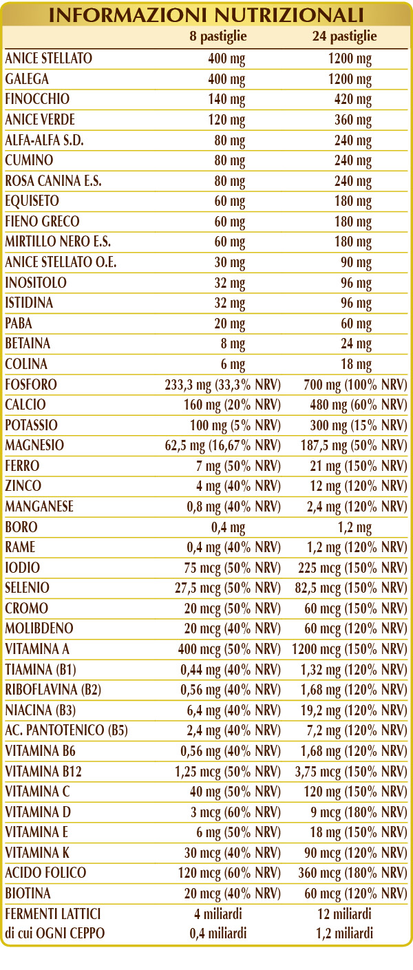 Magnesio glicerofosfato, calcio fosfato bibasico, anice stellato (Illicium verum) frutti Plv, galega (Galega officinalis) erba con fiori Plv, gomma arabica°, cellulosa microcristallina°, calcio glicerofosfato, potassio fosfato bibasico, finocchio (Foeniculum vulgare) frutti Plv, anice verde (Pimpinella anisum) frutti Plv, alfa-alfa o erba medica (Medicago sativa) erba con fiori S.D., cumino (Cuminum cyminum) frutti Plv, rosa canina (Rosa canina) frutti E.S. (titolato al 50% in vitamina C), equiseto o coda cavallina (Equisetum arvense) erba Plv, fieno greco (Trigonella foenum-graecum) semi Plv, mirtillo nero (Vaccinium myrtillus) frutti E.S. (titolato al 25% in antocianosidi), citrato ferrico di ammonio, mio-inositolo di origine vegetale (estratto da semi di mais), (L-)istidina, anice stellato (Illicium verum) frutti O.E., zinco gluconato, silicio biossido°°, PABA (acido p-aminobenzoico), miscela di fermenti lattici (titolata al 10% in ognuno dei seguenti ceppi: Bifidobacterium bifidum SD5215, breve SD5206, lactis SD5219; Lactobacillus acidophilus SD5212, brevis SD5214, bulgaricus SD5589, casei SD5213, paracasei SD5275, plantarum SD5209, rhamnosus SD5217), magnesio stearato di origine vegetale°°, colina tartrato, vitamina E di origine vegetale (acetato di D-α-tocoferile), magnesio ossido, betaina, manganese gluconato, vitamina B3 (niacina), sodio borato, rame gluconato, vitamina B5 (pantotenato di calcio), lichene (Cladonia rangiferina) tallo E.S. (titolato in vitamina D3 colecalciferolo 100.000 UI/g), vitamina B6 (piridossina cloridrato), vitamina B1 (tiamina cloridrato), vitamina B2 (riboflavina), vitamina A (acetato di retinile), cromo picolinato, acido folico, potassio ioduro, sodio selenito, sodio molibdato, vitamina K1 (fillochinone), biotina, vitamina B12 (cianocobalamina).