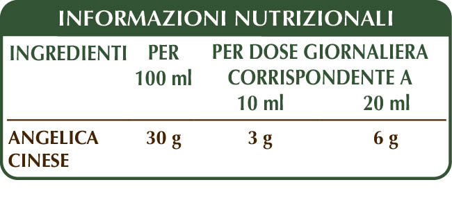 Estratto Integrale Liquido analcoolico ottenuto a partire da: glicerina vegetale bidistillata, acqua pura, angelica cinese (Angelica sinensis) radici.