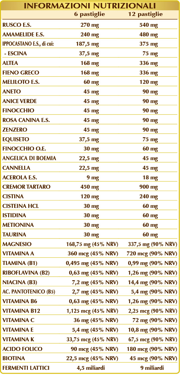 Cremor tartaro di vino purificato, magnesio ossido, rusco o pungitopo (Ruscus aculeatus) radici E.S. (titolato al 5% in ruscogenina), amamelide (Hamamelis virginiana) foglie E.S. (titolato al 10% in tannini), ippocastano (Aesculus hippocastanum) semi E.S (titolato al 20% in escina), gomma arabica°, cellulosa microcristallina°, altea (Althaea officinalis) radici Plv, fieno greco (Trigonella foenum-graecum) semi Plv, (L-)cistina, meliloto (Melilotus officinalis) erba con fiori E.S. (titolato al 20% in cumarine), silicio biossido°°, aneto (Anethum graveolens) frutti Plv, anice verde (Pimpinella anisum) frutti Plv, finocchio (Foeniculum vulgare) frutti Plv, rosa canina (Rosa canina) frutti E.S. (titolato al 70% in vitamina C), zenzero (Zingiber officinalis) rizomi Plv, equiseto o coda cavallina (Equisetum arvense) erba Plv, (L-)cisteina HCL o cloridrato, finocchio (Foeniculum vulgare) frutti O.E., (L-)istidina, (L-)metionina, taurina, angelica di Boemia (Angelica archangelica) radici Plv, cannella (Cinnamomum zeylanicum) cortecce Plv, fermenti lattici (Bacillus coagulans o Lactobacillus sporanges MTCC 25157), magnesio stearato di origine vegetale°°, vitamina E di origine vegetale (acetato di D-α-tocoferile), acerola (Malpighia glabra) frutti E.S. (titolato al 50% in vitamina C), vitamina B3 (niacina), vitamina B5 (pantotenato di calcio), vitamina A (acetato di retinile), vitamina B6 (piridossina cloridrato), vitamina B1 (tiamina cloridrato), vitamina B2 (riboflavina), vitamina K1 (fillochinone), acido folico, biotina, vitamina B12 (cianocobalamina).