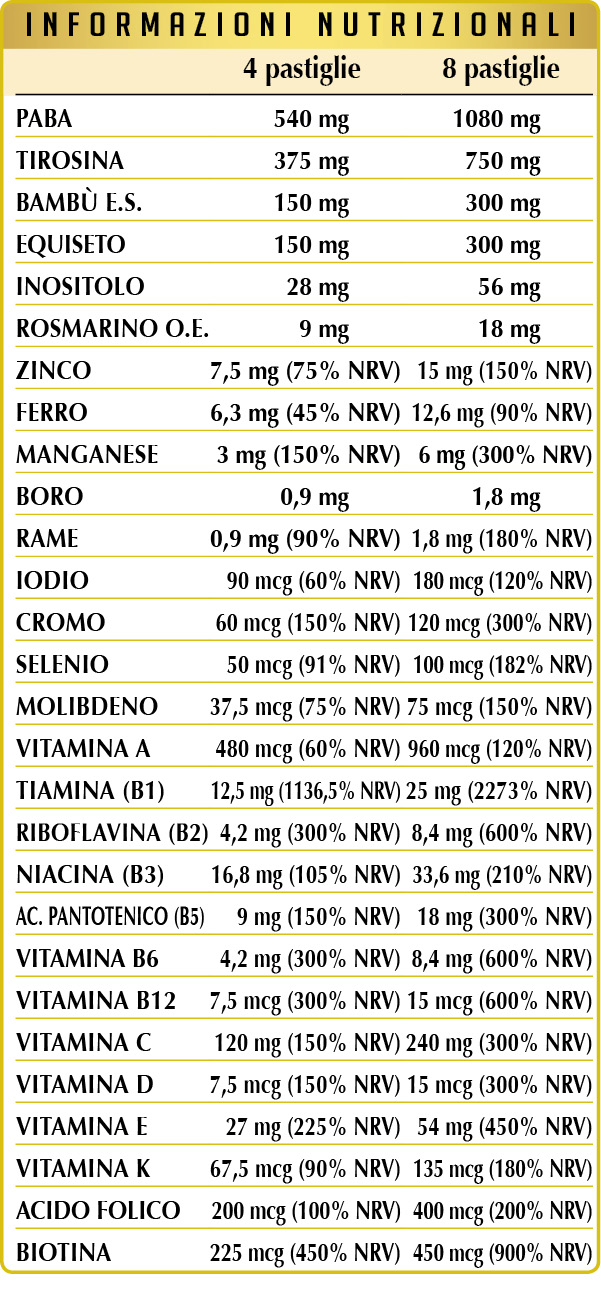 PABA (acido p-aminobenzoico), (L-)tirosina, cellulosa microcristallina°, gomma arabica°, bambù (Bambusa vulgaris) giovani fusti E.S. (titolato al 70% in silice), equiseto o coda cavallina (Equisetum arvense) erba polvere, vitamina C (acido ascorbico), zinco gluconato, vitamina E di origine vegetale (acetato di D-α-tocoferile), ferro gluconato, silicio biossido°°, mio-inositolo di origine vegetale (estratto da semi di mais), manganese gluconato, vitamina B3 (nicotinamide), vitamina B1 (tiamina cloridrato), magnesio stearato di origine vegetale°°, vitamina B5 (pantotenato di calcio), rosmarino (Rosmarinus officinalis) sommità fiorite O.E., sodio borato, vitamina B2 attivata (riboflavina 5-fosfato di sodio), vitamina B6 attivata (piridossale-5-fosfato), rame gluconato, vitamina A (acetato di retinile), lichene (Cladonia rangiferina) tallo E.S. (titolato in vitamina D3 colecalciferolo 100.000 UI/g), cromo picolinato, biotina, acido folico attivato (L-metilfolato di calcio), potassio ioduro, sodio selenito, sodio molibdato, vitamina K1 (fillochinone), vitamina B12 attivata (metilcobalamina, 5-deossiadenosilcobalamina).