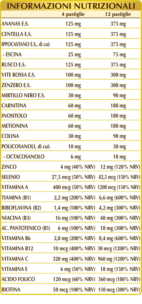 Vitamina C (sodio ascorbato), cellulosa microcristallina°, gomma arabica°, ananas (Ananas comosus) gambi dei frutti E.S. (bromelina 2500 GDU/g), centella (Centella asiatica) erba E.S. (titolato al 20% in derivati triterpenici totali), ippocastano (Aesculus hippocastanum) semi E.S. (titolato al 20% in escina), rusco o pungitopo (Ruscus aculeatus) radici E.S. (titolato al 5% in ruscogenina), calcio fosfato bibasico, zenzero (Zingiber officinalis) rizomi E.S. (titolato al 5% in gingeroli), acetil (L-)carnitina HCL o cloridrato, colina tartrato, mio-inositolo di origine naturale (estratto da semi di mais), (L-)metionina, vite rossa (Vitis vinifera) foglie E.S. (titolato al 5% in polifenoli), silicio biossido°°, vite rossa (Vitis vinifera) semi E.S. (titolato al 95% proantocianidine oligomeriche), zinco gluconato, mirtillo nero (Vaccinium myrtillus) frutti E.S. (titolato al 25% in antocianosidi), vitamina B3 (inositolo esanicotinato), vitamina E di origine vegetale (acetato di D-α-tocoferile), magnesio stearato di origine vegetale°°, policosanoli da canna da zucchero (estratto titolato al 60% in octacosanolo), vitamina B5 (pantotenato di calcio), vitamina B6 attivata (piridossale-5-fosfato), vitamina B1 (tiamina cloridrato), vitamina A (acetato di retinile), vitamina B2 attivata (riboflavina 5-fosfato di sodio), acido folico attivato (L-metilfolato di calcio), sodio selenito, biotina, vitamina B12 attivata (5-deossiadenosilcobalamina, meticobalamina). °Agente di carica. °°Antiagglomerante.