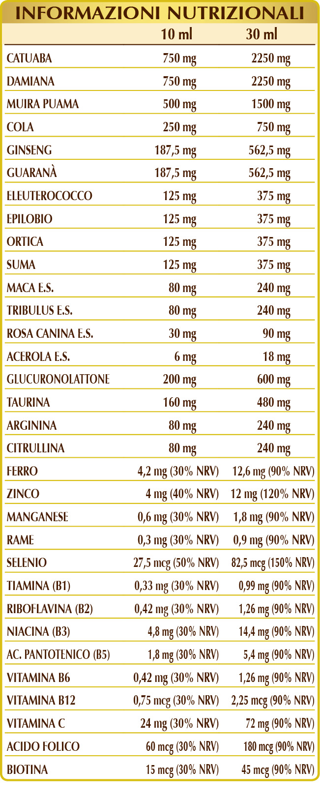Glicerina vegetale bidistillata, acqua pura, catuaba (Anemopaegma mirandum) cortecce E.I.L., damiana (Turnera diffusa) foglie E.I.L., muira puama (Ptychopetalum olacoides) legno E.I.L., cola (Cola nitida) semi E.I.L., glucuronolattone, ginseng (Panax ginseng) radici E.I.L., guaranà (Paullinia cupana) semi verdi (non torrefatti) E.I.L., taurina, eleuterococco o ginseng siberiano (Eleutherococcus senticosus) radici E.I.L., epilobio (Epilobium parviflorum) erba E.I.L., ortica (Urtica dioica) radici E.I.L., suma o ginseng brasiliano (Pfaffia paniculata) radici E.I.L., (L-)arginina, (L-)citrullina, maca o ginseng peruviano (Lepidium meyenii) radici E.S., tribulus terrestris (Tribulus terrestris) frutti E.S. (titolato al 90% in saponine), rosa canina (Rosa canina) frutti E.S. (titolato al 70% in vitamina C), citrato ferrico di ammonio, zinco gluconato, acerola (Malpighia glabra) frutti E.S. (titolato al 50% in vitamina C), manganese gluconato, vitamina B3 (niacina), vitamina B5 (pantotenato di calcio), rame solfato, vitamina B6 (piridossina cloridrato), vitamina B2 (riboflavina), vitamina B1 (tiamina cloridrato), sodio selenito, acido folico, biotina, vitamina B12 (cianocobalamina).