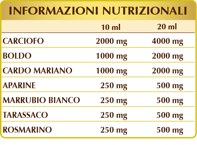 Carciofo, boldo, cardo mariano, tarassaco e rosmarino favoriscono la funzionalità epatica e insieme al marrubio promuovono la funzione digestiva. Il carciofo contribuisce al metabolismo dei lipidi (trigliceridi e colesterolo); inoltre, con cardo mariano, aparine e tarassaco sostiene le funzioni depurative dell’organismo, mentre con marrubio e rosmarino favorisce l’eliminazione dei gas intestinali. Infine, boldo e tarassaco sostengono la regolarità del transito intestinale e insieme ad aparine promuovono il drenaggio dei liquidi corporei.