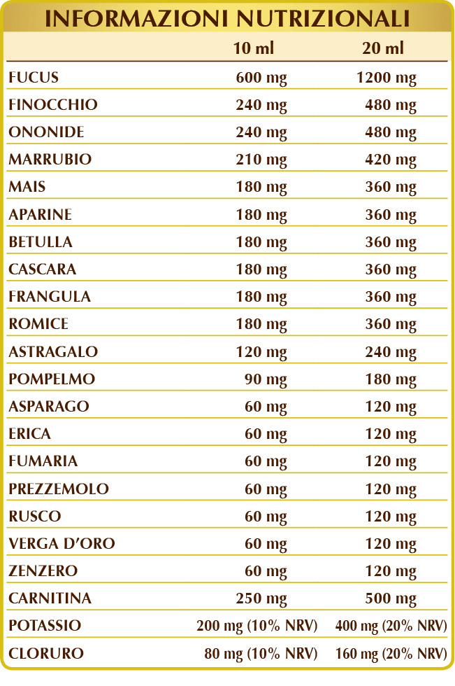 Integratore alimentare coadiuvante di diete ipocaloriche per la riduzione del peso corporeo. Il fucus o quercia marina favorisce l’equilibrio del peso corporeo e stimola il metabolismo. Finocchio, ononide, mais, aparine, betulla bianca, pompelmo, asparago, erica e verga d’oro promuovono il drenaggio dei liquidi corporei.