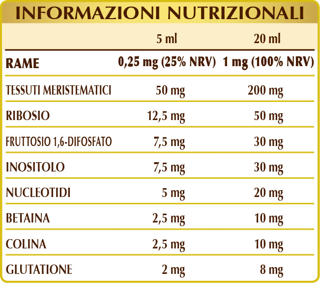 Glicerina vegetale bidistillata, acqua pura; macerato glicerico di tessuti meristematici freschi: ginepro (Juniperus communis) giovani getti, frassino (Fraxinus excelsior) gemme, rosa canina (Rosa canina) giovani getti, prugnolo (Prunus spinosa) gemme; ribosio, fruttosio 1,6-difosfato; correttore di acidità: acido citrico; inositolo, betaina citrato, colina tartrato; miscela di nucleotidi: AMP (adenosina monofosfato), CMP (citosina monofosfato), GMP (guanosina monofosfato), UMP (uridina monofosfato); glutatione ridotto, rame gluconato; edulcorante di origine naturale: taumatina. Con edulcoranti di origine naturale.