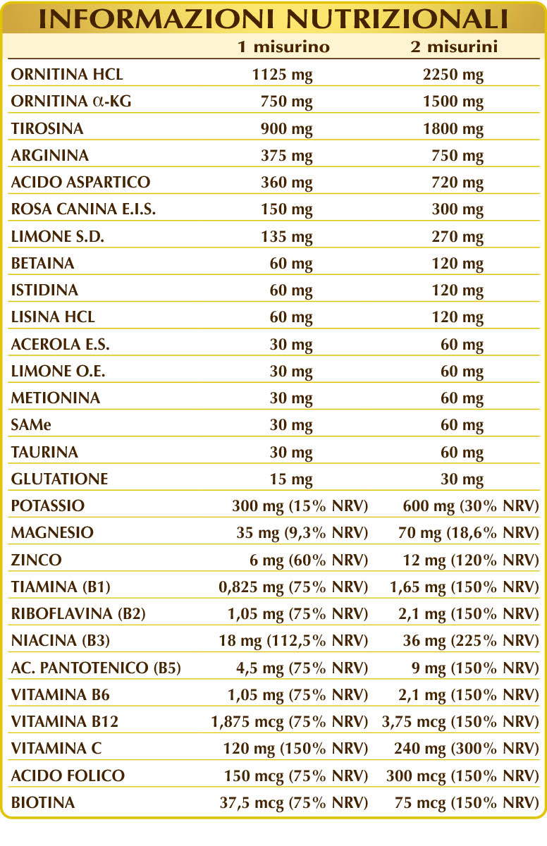 Maltodestrine da mais o riso, (L-)ornitina HCL o cloridrato, (L-)tirosina, potassio citrato, (L-)ornitina α-ketoglutarato (OKG), destrosio, (L-)arginina, acido (L-)aspartico, magnesio citrato bibasico, rosa canina (Rosa canina) frutti E.I.S. (titolato al 70% in vitamina C), limone (Citrus limon) frutti S.D., potassio gluconato; correttore di acidità: acido citrico; magnesio pidolato, magnesio gluconato, betaina, (L-) lisina HCL o cloridrato, (L-)istidina, SAMe (S-adenosil metionina disolfato tosilato), zinco gluconato, acerola (Malpighia glabra) frutti E.S. (titolato al 50% in vitamina C), limone (Citrus limon) scorze dei frutti O.E., (L-)metionina, taurina, vitamina B3 (nicotinamide), glutatione ridotto, vitamina B5 (pantotenato di calcio); edulcoranti di origine naturale: glicosidi steviolici da stevia, taumatina; vitamina B2 attivata (riboflavina 5-fosfato di sodio), vitamina B6 attivata (piridossale-5-fosfato), vitamina B1 (tiamina cloridrato), acido folico attivato (L-metilfolato di calcio), biotina, vitamina B12 attivata (5-deossiadenosilcobalamina, meticobalamina).