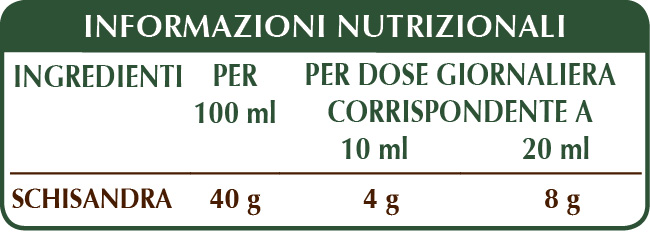 Estratto Integrale Liquido analcoolico ottenuto a partire da: glicerina vegetale bidistillata, acqua pura, schisandra (Schisandra chinensis) frutti.