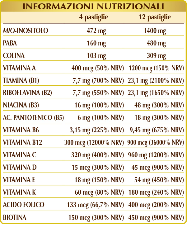 Mio-inositolo di origine naturale (estratto da semi di mais), vitamina C (acido ascorbico), cellulosa microcristallina°, gomma arabica°, colina tartrato, PABA (acido p-aminobenzoico), calcio fosfato bibasico, vitamina E di origine vegetale (acetato di D-α-tocoferile), vitamina B3 (nicotinamide), silicio biossido°°, vitamina B1 (tiamina cloridrato), vitamina B2 (riboflavina), vitamina B5 (pantotenato di calcio), magnesio stearato di origine vegetale°°, vitamina B3 (niacina), vitamina B6 (piridossina cloridrato), vitamina A (acetato di retinile), lichene (Cladonia rangiferina) tallo E.S. (titolato in vitamina D3 colecalciferolo 100.000 UI/g), vitamina K1 (fillochinone), vitamina B12 (cianocobalamina), biotina, acido folico, vitamina D2 (ergocalciferolo) di origine vegetale (da canna da zucchero). E.S.= Estratto secco.