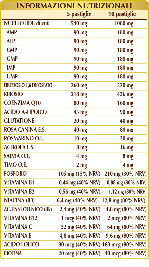 Miscela di nucleotidi: AMP (adenosina monofosfato), ATP (adenosina trifosfato), CMP (citosina monofosfato), GMP (guanosina monofosfato), IMP (inosina monofosfato), UMP (uridina monofosfato); fruttosio 1,6 difosfato, cellulosa microcristallina°, gomma arabica°, ribosio, coenzima Q10, acido α-lipoico, rosa canina (Rosa canina) frutti E.S (titolato al 70% in vitamina C), glutatione, silicio biossido°°, magnesio stearato di origine vegetale°°, vitamina E di origine vegetale (acetato di D-α-tocoferile), rosmarino (Rosmarinus officinalis) sommità fiorite O.E., sorbitolo, acerola (Malpighia glabra) frutti E.S., (titolato al 50% in vitamina C), vitamina B3 (nicotinamide), salvia (Salvia officinalis) foglie O.E., vitamina B5 (pantotenato di calcio), timo volgare (Thymus vulgaris) foglie O.E., vitamina B2 (riboflavina), vitamina B6 (piridossina cloridrato), vitamina B1 (tiamina cloridrato), acido folico, biotina, vitamina B12 (cianocobalamina).