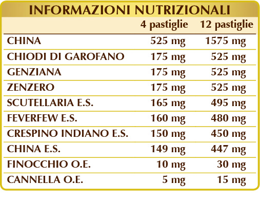 China (Cinchona calisaya) cortecce polvere, chiodi di garofano (Eugenia caryophyllata) gemme floreali polvere, genziana (Gentiana lutea) radici polvere, zenzero (Zingiber officinalis) rizomi polvere, scutellaria (Scutellaria baicalensis) radici E.S. (titolato al 95% in baicalina), feverfew o crisantemo partenio (Tanacetum parthenium) capolini (fiori) E.S. (titolato allo 0,8% in partenolide), crespino indiano (Berberis aristata) cortecce dei rami E.S. (titolato al 97% in berberina), china (Cinchona calisaya) cortecce E.S. (titolato al 99% in chinino solfato), cellulosa microcristallina°, gomma arabica°, silicio biossido°°, finocchio (Foeniculum vulgare) frutti O.E., magnesio stearato di origine vegetale°°, cannella (Cinnamomum zeylanicum) cortecce O.E.