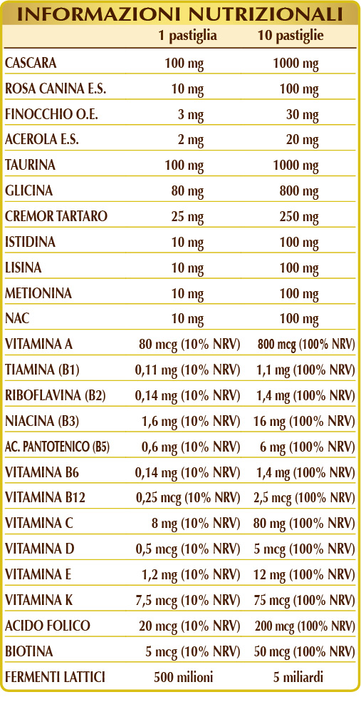 Cascara (Rhamnus purshiana) cortecce polvere, taurina, glicina, cellulosa microcristallina°, gomma arabica°, cremor tartaro di vino purificato, (L-)istidina, (L-)lisina HCL o cloridrato, (L-)metionina, NAC (N-acetilcisteina), rosa canina (Rosa canina) frutti E.S (titolato al 70% in vitamina C), silicio biossido°°, finocchio (Foeniculum vulgare) frutti O.E., vitamina E di origine vegetale (acetato di D-α-tocoferile), fermenti lattici (Bacillus coagulans o Lactobacillus sporanges MTCC 25157), acerola (Malpighia glabra) frutti E.S. (titolato al 50% in vitamina C), magnesio stearato di origine vegetale°°, vitamina B3 (nicotinamide), vitamina B5 (pantotenato di calcio), vitamina A (acetato di retinile), lichene (Cladonia rangiferina) tallo E.S. (titolato in vitamina D3 colecalciferolo 100.000 UI/g), vitamina B6 (piridossina cloridrato), vitamina B1 (tiamina cloridrato), vitamina B2 (riboflavina), acido folico, vitamina K1 (fillochinone), biotina, vitamina B12 (cianocobalamina).