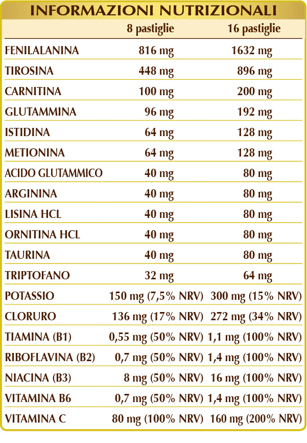 (DL-)fenilalanina, (L-)tirosina, cellulosa microcristallina°, gomma arabica°, potassio cloruro, (L-)carnitina tartrato, silicio biossido°°, (L-)glutammina, vitamina C (acido ascorbico), (L-)metionina, (L-)istidina, acido (L-)glutammico, (L-)arginina, (L-)lisina HCL o cloridrato, (L-)ornitina HCL o cloridrato, taurina, (L-)triptofano, magnesio stearato di origine vegetale°°, vitamina B3 (niacina), vitamina B6 (piridossina cloridrato), vitamina B2 (riboflavina), vitamina B1 (tiamina cloridrato).
