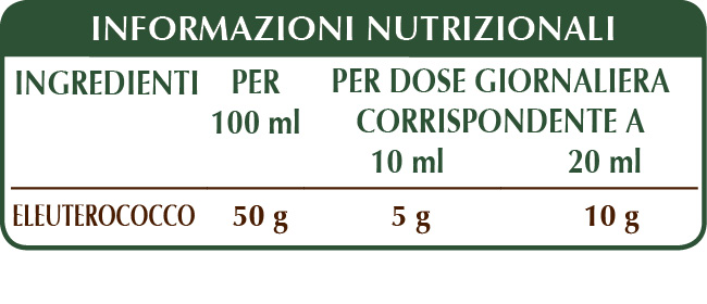 Estratto Integrale Liquido analcoolico ottenuto a partire da: glicerina vegetale bidistillata, acqua pura, eleuterococco o ginseng siberiano (Eleutherococcus senticosus) radici.