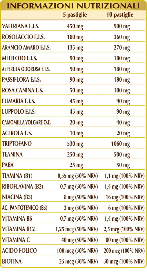 (L-)triptofano, valeriana (Valeriana officinalis) radici E.I.S., (L-)teanina, rosolaccio (Papaver rhoeas) fiori E.I.S., cellulosa microcristallina°, gomma arabica°, arancio amaro (Citrus aurantium var. amara) foglie e fiori E.I.S., meliloto (Melilotus officinalis) erba con fiori E.I.S., passiflora (Passiflora incarnata) erba con fiori E.I.S., asperula odorosa (Galium odoratum) erba con fiori E.I.S., rosa canina (Rosa canina) frutti E.S. (titolato al 70% in vitamina C), fumaria (Fumaria officinalis) erba con fiori E.I.S., luppolo (Humulus lupulus) strobili (fiori femminili) E.I.S., gelatina alimentare°°, silicio biossido°°, PABA (acido p-aminobenzoico), camomilla volgare (Matricaria chamomilla) capolini (fiori) O.E., magnesio stearato di origine vegetale°°, acerola (Malpighia glabra) frutti E.S. (titolato al 50% in vitamina C), vitamina B3 (nicotinamide), vitamina B5 (pantotenato di calcio), vitamina B6 (piridossina cloridrato), vitamina B2 (riboflavina), vitamina B1 (tiamina cloridrato), acido folico, biotina, vitamina B12 (cianocobalamina).