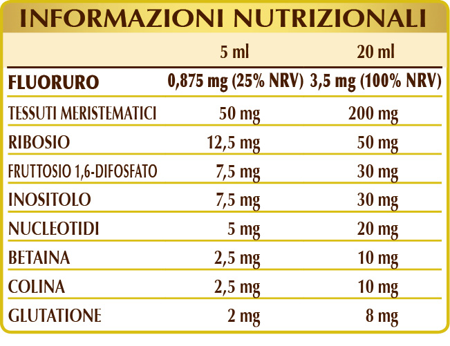 Glicerina vegetale bidistillata, acqua pura; macerato glicerico di tessuti meristematici freschi: abete bianco (Abies pectinata, sinonimo Abies alba) gemme, pino montano (Pinus montana, sinonimi Pinus mugo o Pinus pumilio) gemme, vite canadese (Ampelopsis veitchii, sinonimo Parthenocissus tricuspidata) giovani getti; ribosio, fruttosio 1,6-difosfato; correttore di acidità: acido citrico; inositolo, betaina citrato, colina tartrato; miscela di nucleotidi: AMP (adenosina monofosfato), CMP (citosina monofosfato), GMP (guanosina monofosfato), UMP (uridina monofosfato); glutatione ridotto, sodio fluoruro; edulcorante di origine naturale: taumatina. Con edulcoranti di origine naturale.