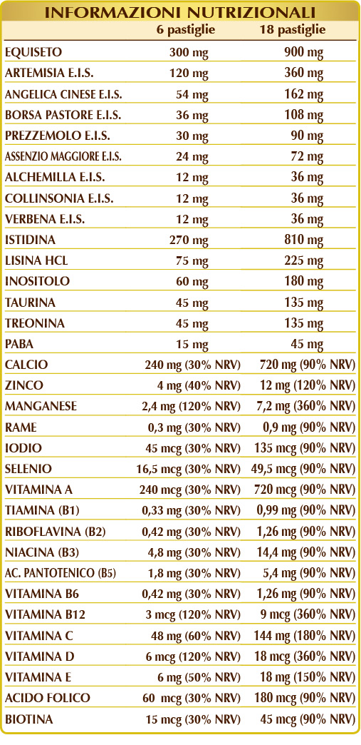 Calcio lattato, equiseto o coda cavallina (Equisetum arvense) erba polvere, (L-)istidina, calcio fosfato bibasico, cellulosa microcristallina°, gomma arabica°, artemisia (Artemisia vulgaris) erba con fiori E.I.S., calcio carbonato, (L-)lisina HCL o cloridrato, inositolo di origine vegetale (estratto da semi di mais), angelica cinese (Angelica sinensis) radici E.I.S., vitamina C (acido ascorbico), taurina, (L-)treonina, borsa pastore (Capsella bursa-pastoris) erba E.I.S., silicio biossido°°, zinco gluconato, prezzemolo (Petroselinum crispum) frutti E.I.S., assenzio maggiore o romano (Artemisia absinthium) erba con fiori E.I.S., manganese gluconato, PABA (acido p-aminobenzoico), vitamina E di origine vegetale (acetato di D-α-tocoferile), magnesio stearato di origine vegetale°°, alchemilla (Alchemilla vulgaris) erba E.I.S., collinsonia (Collinsonia canadensis) radici E.I.S., verbena (Verbena officinalis) erba con fiori E.I.S., vitamina B3 (niacina), rame gluconato, vitamina B5 (pantotenato di calcio), vitamina A (acetato di retinile), vitamina B6 (piridossina cloridrato), vitamina B1 (tiamina cloridrato), vitamina B2 (riboflavina), acido folico, potassio ioduro, sodio selenito, biotina, vitamina D3 (colecalciferolo) di origine vegetale (estratta da lichene Cladonia rangiferina), vitamina B12 (cianocobalamina).