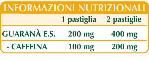 Guaranà (Paullinia cupana) semi E.S. (titolato al 50% in caffeina), maltodestrine da mais o riso, cellulosa microcristallina°, gomma arabica°, silicio biossido°°, magnesio stearato di origine vegetale°°.