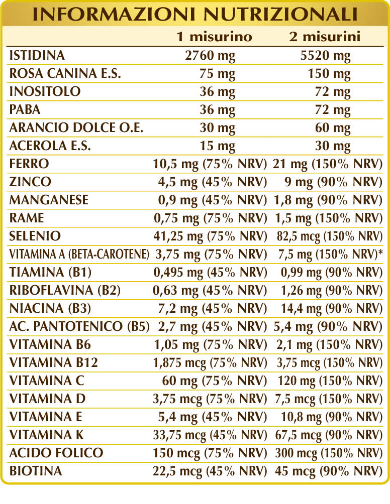 (L-)istidina, maltodestrine da mais o riso, rosa canina (Rosa canina) frutti E.S. (titolato al 70% in vitamina C), citrato ferrico di ammonio, carota (Daucus carota) radici E.S. (titolato al 10% in beta-carotene), inositolo di origine vegetale (estratto da semi di mais), PABA (acido p-aminobenzoico), zinco gluconato; aroma naturale: arancio dolce (Citrus aurantium var. sinensis o dulcis) scorze dei frutti O.E.; acerola (Malpighia glabra) frutti E.S. (titolato al 50% in vitamina C), vitamina E (acetato di DL-α-tocoferile); edulcoranti di origine naturale: glicosidi steviolici da stevia, taumatina; manganese gluconato, vitamina B3 (niacina), rame solfato, vitamina B5 (pantotenato di calcio), vitamina B6 (piridossina cloridrato), vitamina K1 (fillochinone), vitamina B1 (tiamina cloridrato), vitamina B2 (riboflavina), acido folico, sodio selenito, biotina, vitamina D3 (colecalciferolo), vitamina B12 (cianocobalamina).