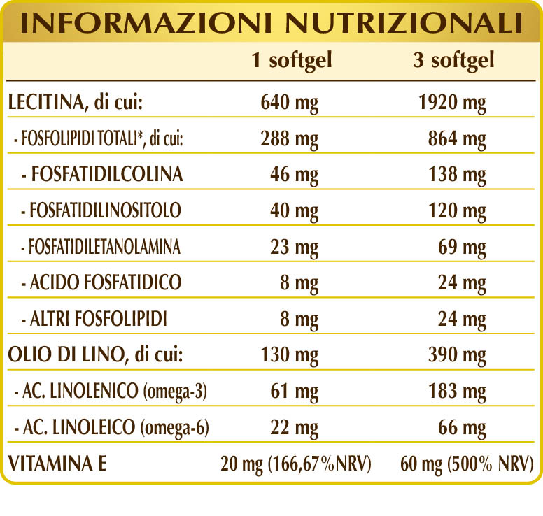 Girasole (Helianthus annuus) lecitina di semi certificata non OGM (45% fosfolipidi), lino (Linum usitatissimum) olio di semi, vitamina E di origine naturale (D-α-tocoferolo); eccipienti  (softgel):  gelatina alimentare e glicerina.