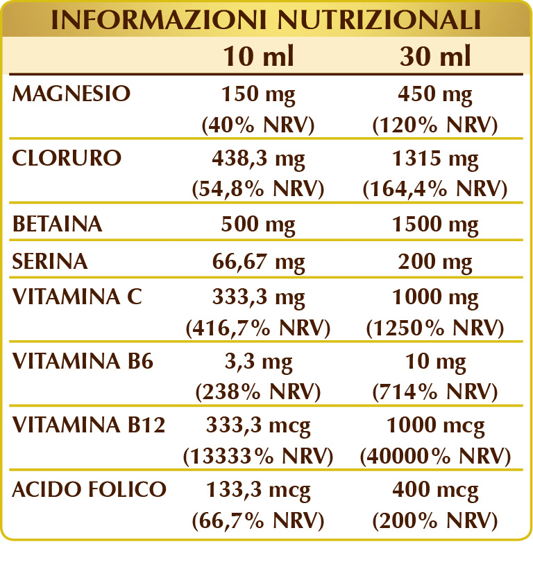 Glicerina vegetale bidistillata, acqua pura, betaina base, rosa canina (Rosa canina) frutti estratto integrale secco contenente l’intero fitocomplesso (titolato al 50% in vitamina C), magnesio cloruro esaidrato; edulcoranti di origine naturale: eritritolo, glicosidi steviolici da stevia, taumatina; (L-)serina, vitamina B6 attivata (piridossale 5-fosfato) vitamina B12 attivata (5-deossiadenosilcobalamina, metilcobalamina), acido folico attivato (L-metilfolato di calcio).