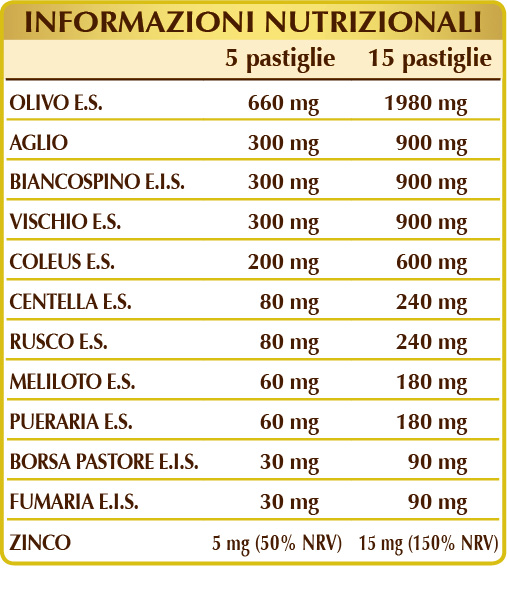 Olivo (Olea europaea) foglie E.S. (titolato al 40% in oleuropeina), aglio (Allium sativum) bulbi essiccati a bassa temperatura polvere, biancospino (Crataegus oxyacantha) fiori e foglie E.I.S., vischio (Viscum album) foglie E.S., coleus (Coleus forskohlii) radici E.S. (titolato al 10% in forskohlina), gomma arabica°, cellulosa microcristallina°, centella (Centella asiatica) erba E.S. (titolato al 20% in derivati triterpenici), rusco o pungitopo (Ruscus aculeatus) radici E.S. (titolato al 5% in ruscogenina), meliloto (Melilotus officinalis) erba con fiori E.S. (titolato al 20% in cumarine), pueraria (Pueraria lobata) radici E.S. (titolato al 40% in isoflavoni), zinco gluconato, borsa pastore (Capsella bursa-pastoris) erba E.I.S., fumaria (Fumaria officinalis) erba con fiori E.I.S., silicio biossido°°, magnesio stearato di origine vegetale°°. °Agente di carica. °°Antiagglomerante.