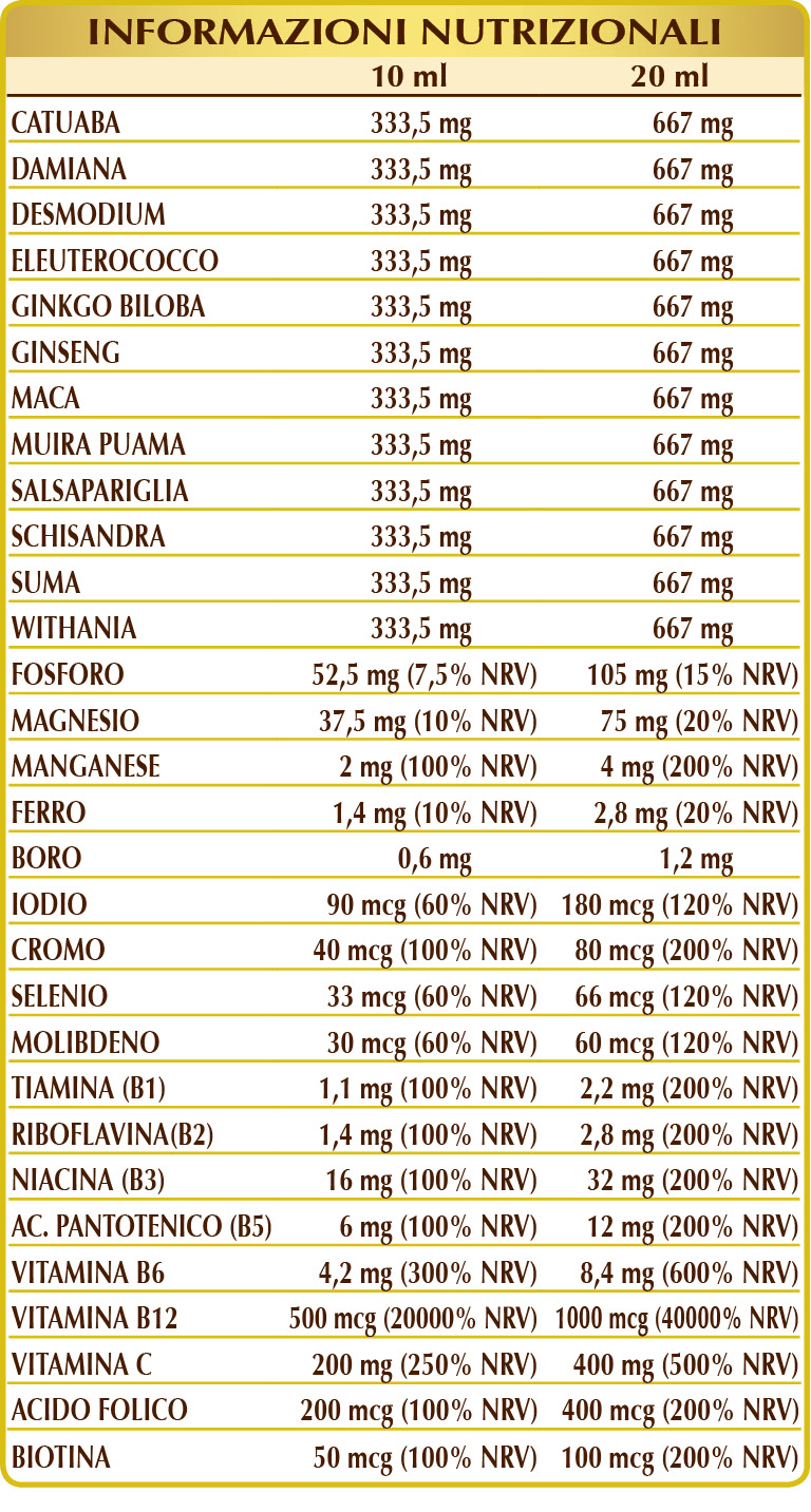 Glicerina vegetale bidistillata, acqua pura, catuaba (Erythroxylum catuaba) cortecce E.I.L., damiana (Turnera diffusa) foglie E.I.L., desmodium (Desmodium adscendens) foglie E.I.L., eleuterococco o ginseng siberiano (Eleutherococcus senticosus) radici E.I.L., ginkgo biloba (Ginkgo biloba) foglie E.I.L., ginseng (Panax ginseng) radici E.I.L., maca o ginseng peruviano (Lepidium meyenii) radici E.I.L., muira puama (Ptychopetalum olacoides) legno E.I.L., salsapariglia (Smilax medica) radici E.I.L, schisandra (Schisandra chinensis) frutti E.I.L., suma o ginseng brasiliano (Pfaffia paniculata) radici E.I.L., withania o ashwagandha o ginseng indiano (Withania somnifera) radici E.I.L., magnesio glicerofosfato, vitamina C (ascorbato di sodio), manganese gluconato, citrato ferrico di ammonio, vitamina B3 (nicotinamide e niacina); edulcoranti di origine naturale: glicosidi steviolici da stevia, taumatina; vitamina B5 (pantotenato di calcio), sodio borato, vitamina B6 (piridossina cloridrato), vitamina B2 (riboflavina 5-fosfato di sodio), vitamina B1 (tiamina cloridrato), vitamina B12 (cianocobalamina), cromo cloruro, acido folico, potassio ioduro, sodio molibdato, sodio selenito, botina.