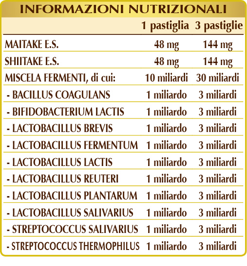 Cellulosa microcristallina°, gomma arabica°, maitake (Grifola frondosa) tallo E.S. (titolato al 30% in polisaccaridi), shiitake (Lentinula edodes) tallo E.S. (titolato al 30% in polisaccaridi), maltodestrine da mais o riso, miscela di fermenti lattici (titolata a 23,5 Mld/g in ognuno dei seguenti ceppi: Bacillus coagulans BCM9; Bifidobacterium lactis BALM27; Lactobacillus brevis LBRM45, fermentum LFM33, lactis LLM48, plantarum LPM27, reuteri LBRR16, salivarius LSM51; Streptococcus salivarius SSM12, thermophilus STM9), silicio biossido°°, magnesio stearato di origine vegetale°°; edulcoranti di origine vegetale: glicosidi steviolici da stevia e taumatina. °Agente di carica. °°Antiagglomerante.