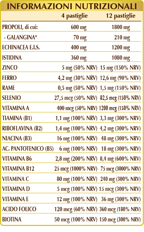 Propoli (Propolis) resina, echinacea (Echinacea angustifolia, purpurea, pallida) radici E.I.S., (L-)istidina, calcio fosfato bibasico, cellulosa microcristallina°, gomma arabica°, vitamina C (acido ascorbico), silicio biossido°°, zinco gluconato, ferro gluconato, vitamina E di origine vegetale (acetato di D-α-tocoferile), vitamina B3 (nicotinamide), magnesio stearato di origine vegetale°°, vitamina B5 (pantotenato di calcio), rame gluconato, vitamina B6 (piridossina cloridrato), vitamina A (acetato di retinile), lichene (Cladonia rangiferina) tallo E.S. (titolato in vitamina D3 colecalciferolo 100.000 UI/g), vitamina B1 (tiamina cloridrato), vitamina B2 (riboflavina), acido folico, sodio selenito, biotina, vitamina B12 (cianocobalamina). E.S.= Estratto secco. °Agente di carica. °°Antiagglomerante.
