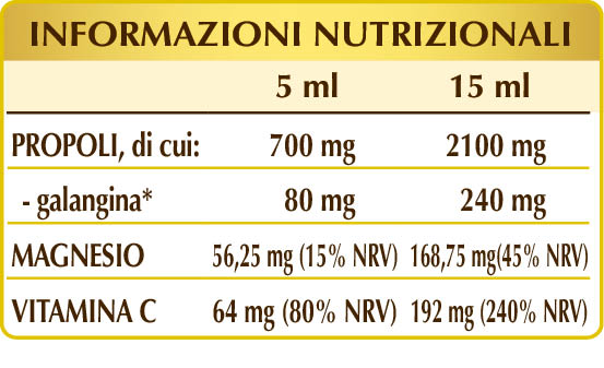 *flavonoidi totali espressi in galangina. NRV= Valore Nutritivo di Riferimento.