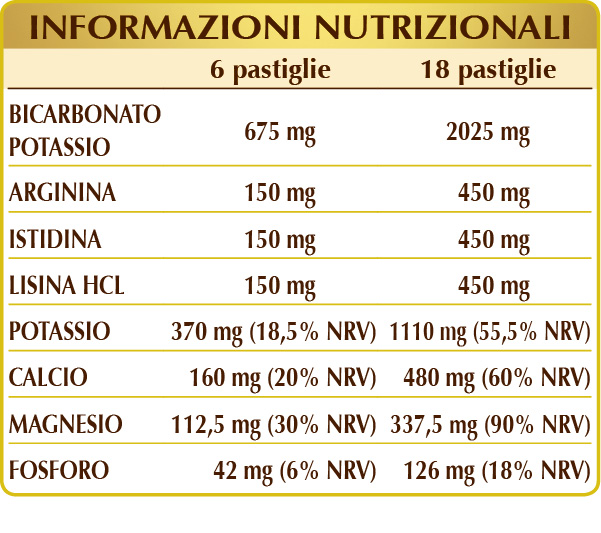 Potassio bicarbonato, gomma arabica°, cellulosa microcristallina°, calcio carbonato, potassio fosfato bibasico, (L-)arginina, (L-)istidina, (L-)lisina HCL o cloridrato, magnesio ossido, magnesio carbonato, silicio biossido°°, magnesio stearato di origine vegetale°°.