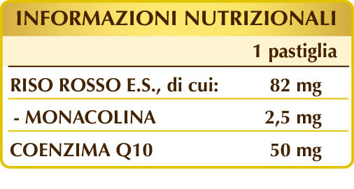 Riso rosso fermentato (Oryza sativa fermentata con lievito Monascus purpureus) semi E.S. (titolato al 3% in monacolina K), coenzima Q10, maltodestrine da mais o riso, cellulosa microcristallina°, gomma arabica°, silicio biossido°°, magnesio stearato di origine vegetale°°. °Agente di carica. °°Antiagglomerante.