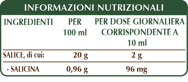 Estratto Integrale Liquido analcoolico ottenuto a partire da: glicerina vegetale bidistillata, acqua pura, salice (Salix alba e purpurea) cortecce.
