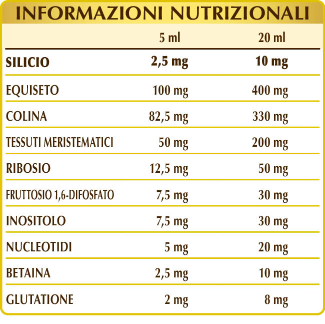 Glicerina vegetale bidistillata, acqua pura, acido ortosilicico stabilizzato con colina (Si 1%), equiseto o coda cavallina (Equisetum arvense) erba E.I.L., equiseto o coda cavallina (Equisetum arvense) macerato glicerico di tessuti meristematici o gemme fresche, ribosio, fruttosio 1,6-difosfato; correttore di acidità: acido citrico; inositolo, betaina citrato, colina tartrato; miscela di nucleotidi: AMP (adenosina monofosfato), CMP (citosina monofosfato), GMP (guanosina monofosfato), UMP (uridina monofosfato); glutatione ridotto; edulcoranti di origine naturale: taumatina. Con edulcoranti di origine naturale.