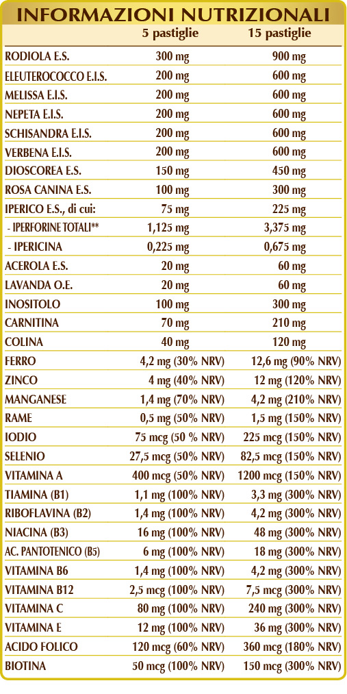 Rodiola (Rhodiola rosea) radici E.S. (titolato al 3% in rosavina e all’1% in salidroside), eleuterococco o ginseng siberiano (Eleutherococcus senticosus) radici E.I.S., melissa (Melissa officinalis) foglie E.I.S., nepeta (Nepeta cataria) erba con fiori E.I.S., schisandra (Schisandra chinensis) frutti E.I.S., verbena (Verbena officinalis) erba con fiori E.I.S., cellulosa microcristallina°, gomma arabica°, dioscorea (Dioscorea opposita) rizomi E.S. (titolato al 16% in diosgenina), mio-inositolo, rosa canina (Rosa canina) frutti E.S. (titolato al 70% in vitamina C), colina tartrato, carnitina, iperico (Hypericum perforatum) erba con fiori E.S. (titolato allo 0,3% in ipericina, rapporto iperforine/ipericina= 5), silicio biossido°°, ferro gluconato, zinco gluconato, vitamina E di origine vegetale (acetato di D-α-tocoferile), acerola (Malpighia glabra) frutti E.S. (titolato al 50% in vitamina C), lavanda (Lavandula officinalis) sommità fiorite O.E., manganese gluconato, vitamina B3 (nicotinamide), magnesio stearato di origine vegetale°°, vitamina B5 (pantotenato di calcio), rame gluconato, vitamina A (acetato di retinile), vitamina B6 (piridossina cloridrato), vitamina B2 (riboflavina), vitamina B1 (tiamina cloridrato), acido folico, potassio ioduro, sodio selenito, biotina, vitamina B12 (cianocobalamina). °Agente di carica. °°Antiagglomerante.