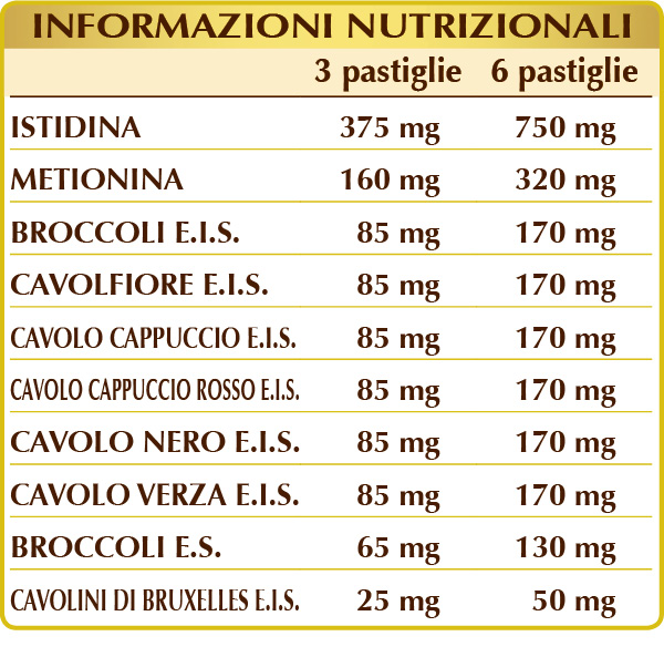 Integratore a base di estratto di broccoli e cavoli, arricchito con istidina e metionina. Broccoli, cavolfiore e tutte le specie di cavolo impiegate per la preparazione dell’estratto, possiedono un’azione antiossidante, favoriscono la regolare funzionalità dell’apparato cardiovascolare, sostengono la funzione digestiva e contribuiscono al mantenimento della normale funzionalità articolare.
