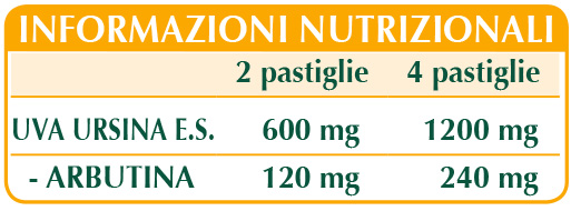 Uva ursina (Arctostaphylos uva-ursi) foglie E.S. (titolato al 20% in arbutina), cellulosa microcristallina°, gomma arabica°, maltodestrine da mais o riso, silicio biossido°°, magnesio stearato di origine vegetale°°.