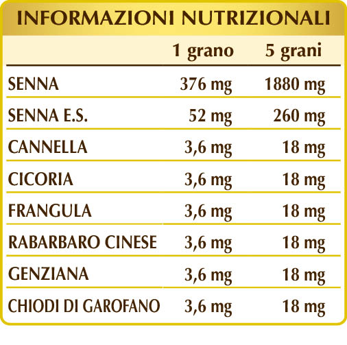 Senna (Cassia angustifolia) foglie Plv, senna (Cassia angustifolia) foglie E.S., cannella (Cinnamomum zeylanicum) cortecce Plv, cicoria (Cichorium intybus) radici Plv, frangula (Rhamnus frangula) cortecce Plv, rabarbaro cinese (Rheum palmatum) rizomi Plv, genziana (Gentiana lutea) radici Plv, chiodi di garofano (Eugenia caryophyllata) gemme floreali Plv.