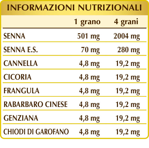 Senna, cicoria, frangula e rabarbaro favoriscono la regolarità del transito intestinale. Cannella, chiodi di garofano e genziana contribuiscono all’eliminazione dei gas intestinali e promuovono la funzione digestiva.