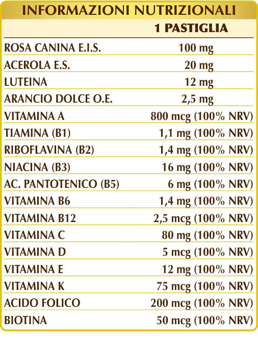 Tagete (Tagetes erecta) capolini (fiori) E.S. (titolato al 10% in luteina), rosa canina (Rosa canina) frutti E.I.S. (titolato al 70% in vitamina C), maltodestrine da mais o riso, cellulosa microcristallina°, gomma arabica°, vitamina E di origine vegetale (acetato di D-α-tocoferile), acerola (Malpighia glabra) frutti E.S. (titolato al 50% in vitamina C), vitamina B3 (nicotinamide), silicio biossido°°, vitamina B5 (pantotenato di calcio), vitamina A (acetato di retinile); aroma naturale: arancio dolce (Citrus aurantium var. sinensis o dulcis) scorze dei frutti O.E.; magnesio stearato di origine vegetale°°, vitamina B2 attivata (riboflavina 5-fosfato di sodio), vitamina B6 attivata (piridossale-5-fosfato), lichene (Cladonia rangiferina) tallo E.S. (titolato in vitamina D3 colecalciferolo 100.000 UI/g), vitamina B1 (tiamina cloridrato), acido folico attivato (L-metilfolato di calcio), vitamina K1 (fillochinone), biotina, vitamina B12 attivata (5-deossiadenosilcobalamina, meticobalamina). °Agente di carica. °°Antiagglomerante.