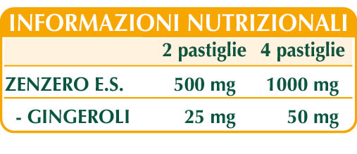 Zenzero (Zingiber officinalis) rizomi E.S. (titolato al 5% in gingeroli), maltodestrine da mais o riso, cellulosa microcristallina°, gomma arabica°, silicio biossido°°, magnesio stearato di origine vegetale°°.